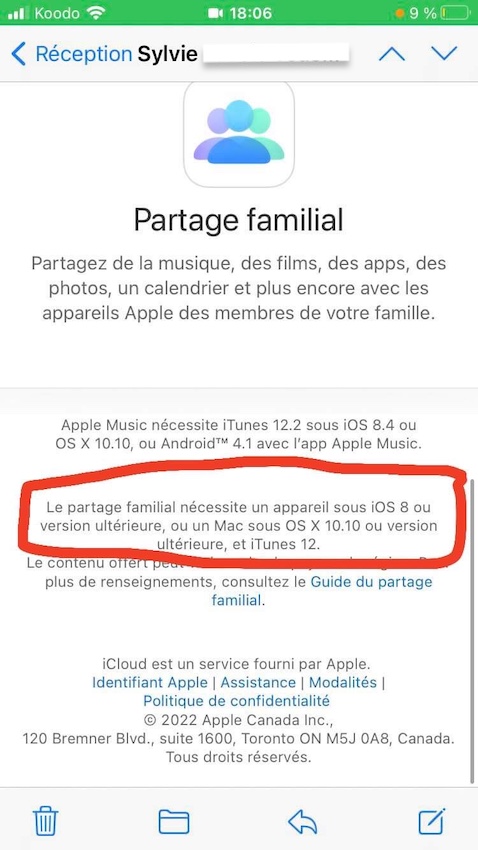 Bonjour , je sais tout ça mais lorsque je clique sur le lien ça ne fonctionne pas. Serait il possible que ma version iOS (iOS 15.3) soit désuète pour le partage familial?