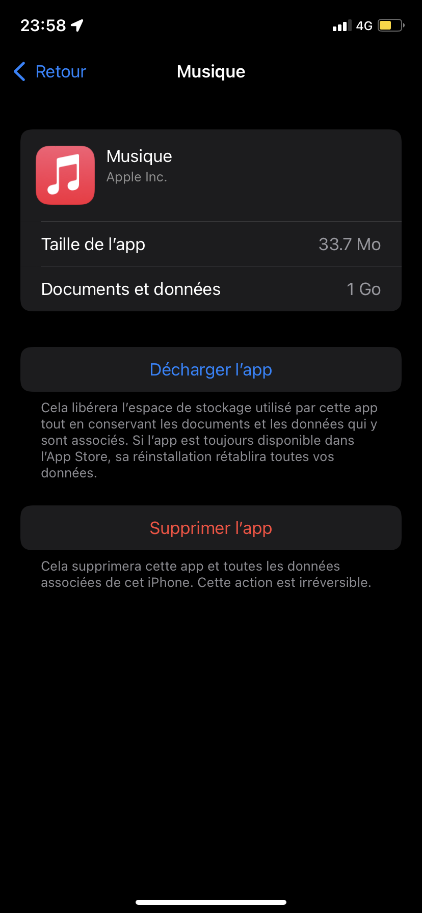 Bonjour, j’ai un problème avec mon stockage, depuis déjà quelque temps je remarque que l’application Musique prend pas mal de place ça ne me faisait pas ça avant quand je vais dans mon stockage et puis dans Musique c’est écrit que le ce sont les documents et données qui prennent le plus de place, ce que je ne comprend pas c’est que avant ça me prenait de la place parce que j’avais téléchargé beaucoup de musiques et j’ai dû supprimer tous les téléchargements donc à ce moment les documents et données prenaient peu de place, jusqu’à comme je l’ai dit, que ça prennent plus de place sans raison je ne comprend pas.