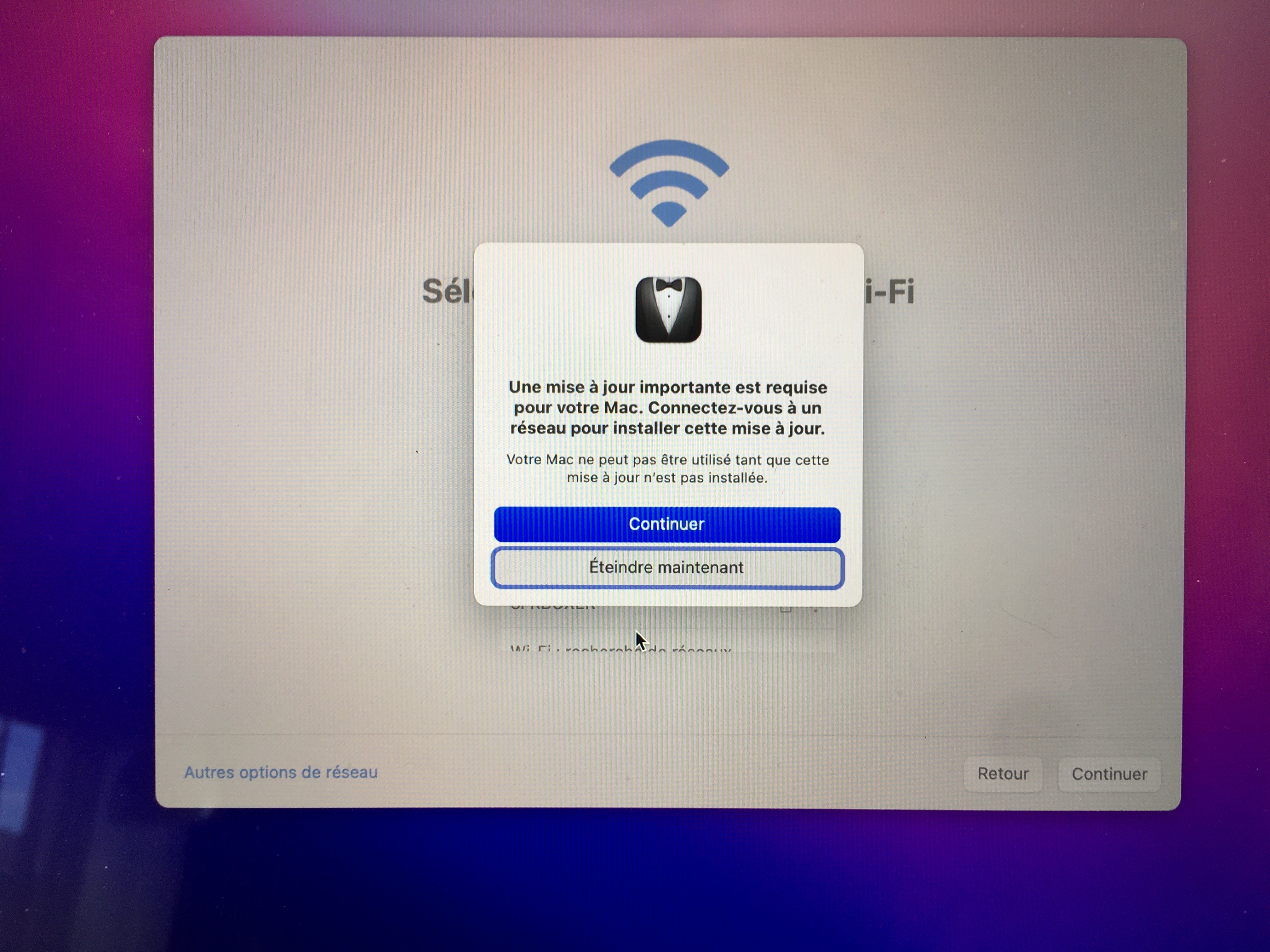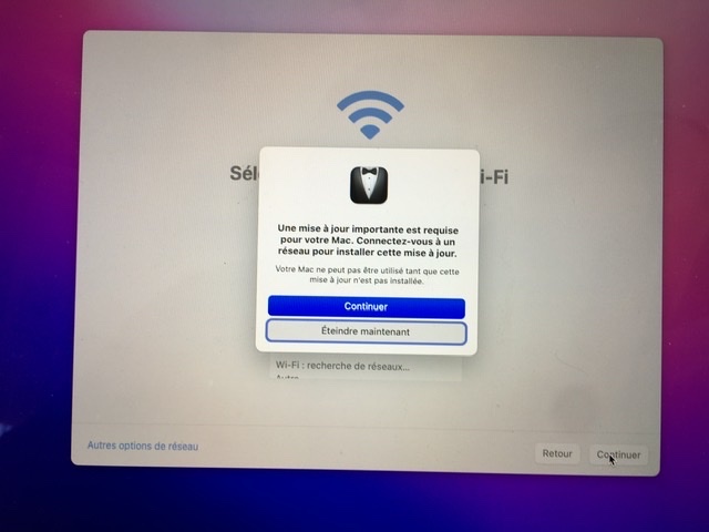 j’arrive sur un écran me demandant le mode de passe de mon réseau wifi pour finaliser la mise à jour mais impossible d’entrer le mot de passe, celui-ci est systématiquement refusé.