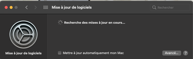 J'ai la version Mac OS Big Sur 11.6.2 sur mon iMac. Je sais qu'il est possible de mettre à jour vers 11.6.4 mais lorsque je souhaite faire cette MAJ, la page reste sur "recherche des mises à jour en cours" avec la roue qui tourne. (voir capture d'écran)