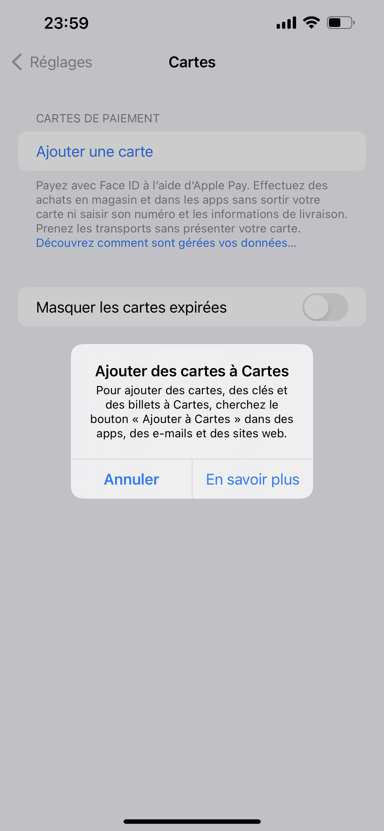 ℹ️ Si vous ne pouvez pas ajouter de cartes à l’app Cartes d’Apple en vue de les utiliser avec Apple Pay