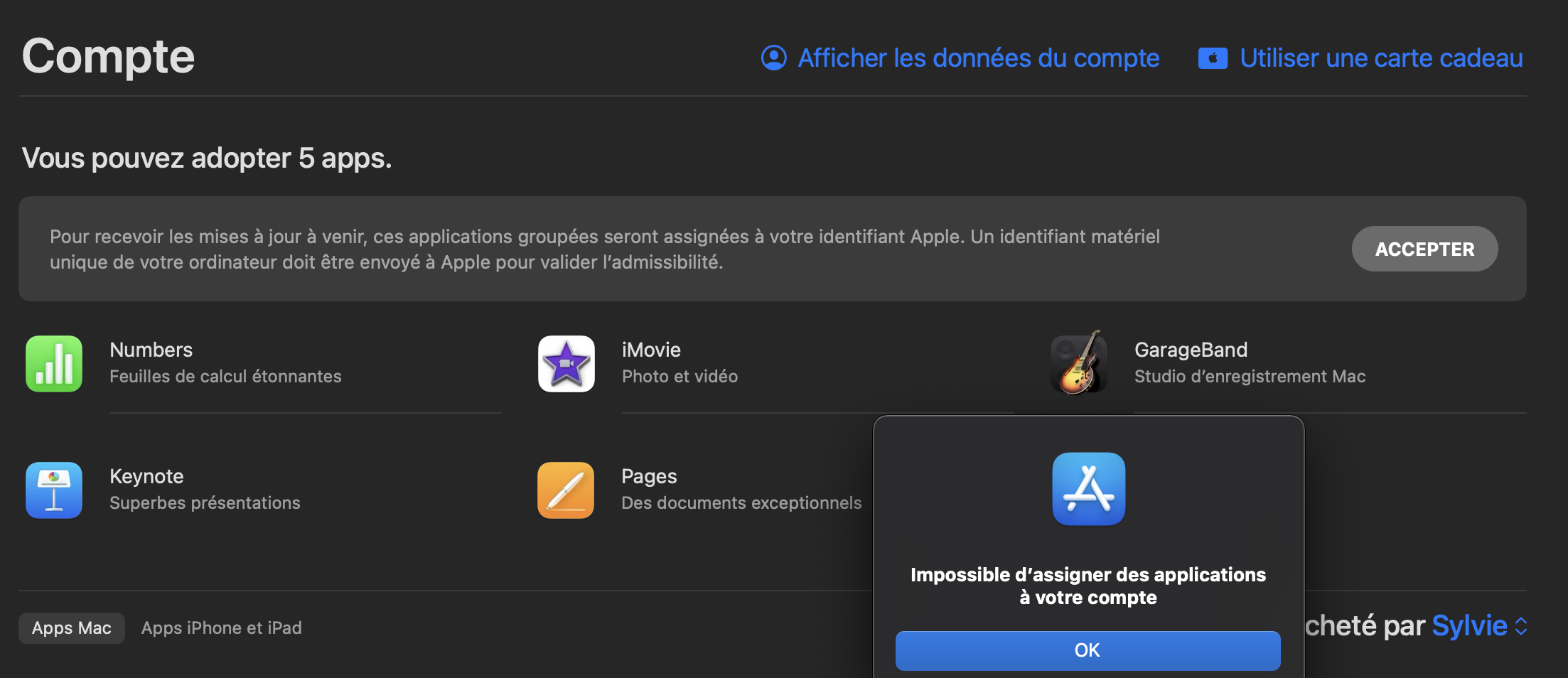 Dans mon compte, on me demande « d'adopter » les 5 apps, mais ça me dit « impossible d'assigner des applications à votre compte », et un message demande d'envoyer un « identifiant matériel unique » à Apple. Aucune idée comment...