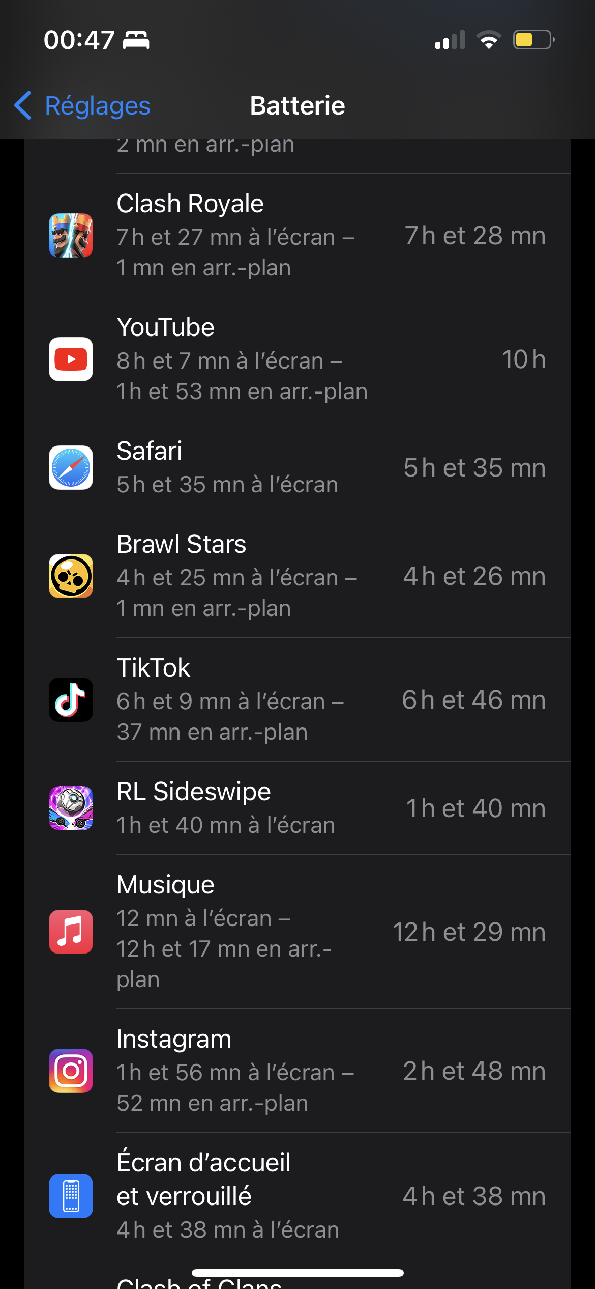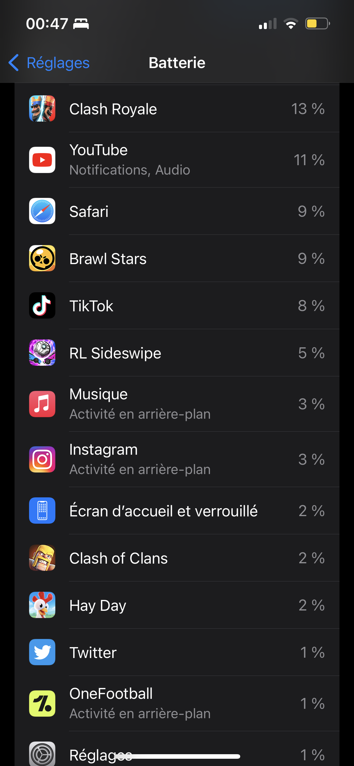 Bonjour, lorsque je me rend dans réglage<batterie je vois un graphique avec l’utilisation de la batterie. En dessous il y a le même graphique représenté avec les applications sauf que je ne comprends pas ce que les % signifient à côté de chaque applications. Exemple: j’ai utiliser Instagram +\- 3h par jour et le graphe me dit 1h30 avec comme utilisation de batterie (10%) sur 10 jours. Quel est là significations de ces 10% Or que j’ai sans doute utiliser + de 100% de la batterie sur une semaine avec Instagram.