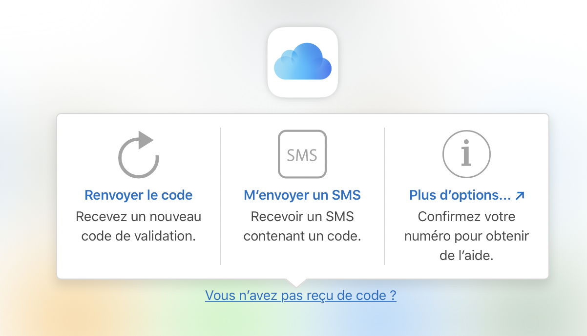 Si tu n'as plus accès à tes appareils de confiance, tu peux recevoir ce code de validation par SMS sur ton numéro de téléphone de confiance. Pour cela, il te suffit de cliquer sur Vous n'avez pas reçu de code ? sur l’écran de connexion, puis de demander l’envoi du code au numéro de confiance en cliquant sur M'envoyer un SMS.
