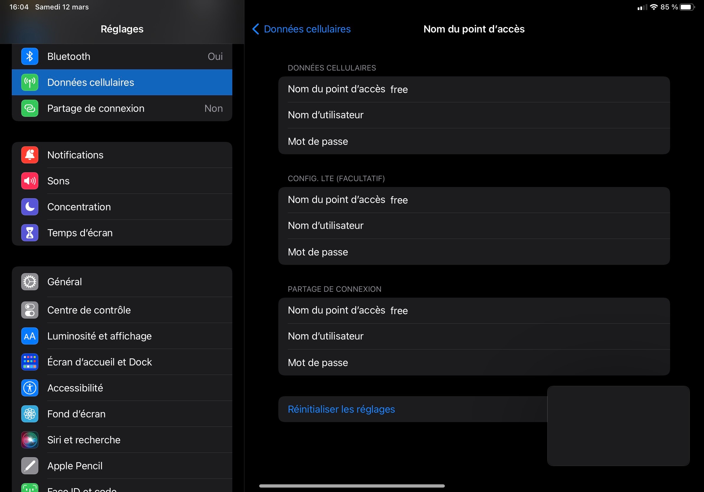 Il suffit d'indiquer " free" dans les 3 champs du nom du point d’accès (APN)