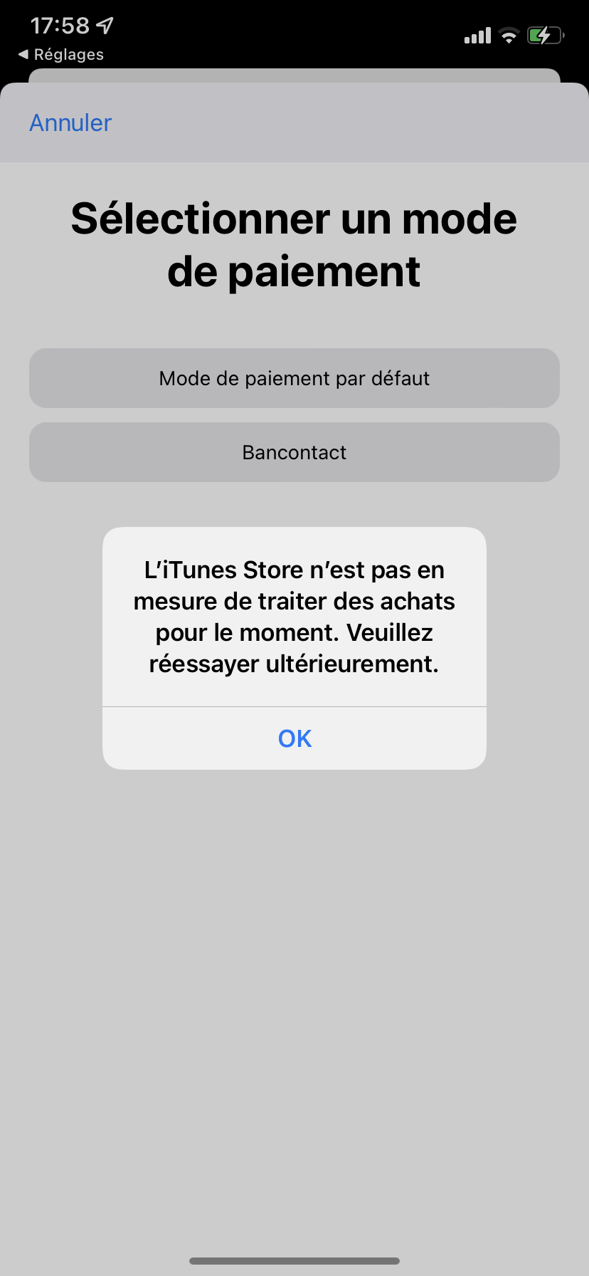 Donc ce n'est pas du tout un souci de paiement refusé, c'est plutôt une bonne nouvelle 😉. Grâce à ta capture d'écran, ça me fait plutôt penser à un souci de connexion Internet, ou au serveur Apple.