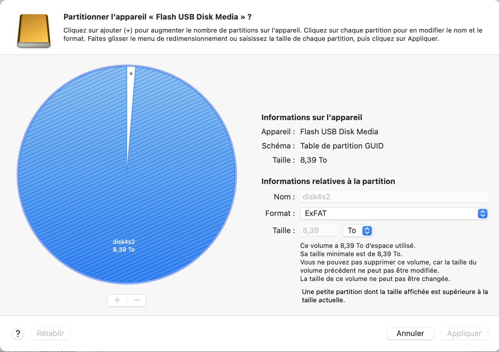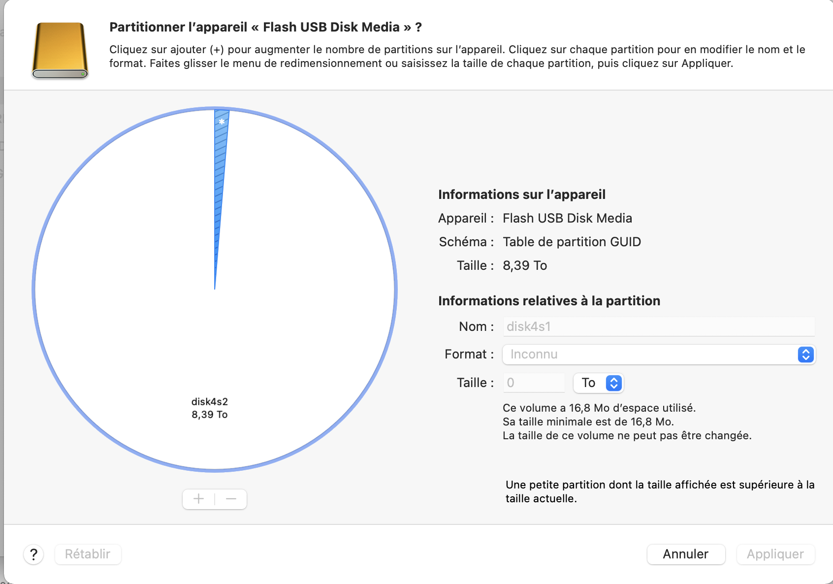 Si j’affiche le partitionnement je vois appareil Flash USB disk Média, table de partition GUID 8,39 To et semble t il une petite partition de 16,8 Méga nommée « disk5s1 » format inconnu. L’autre partition serait en ExFat.