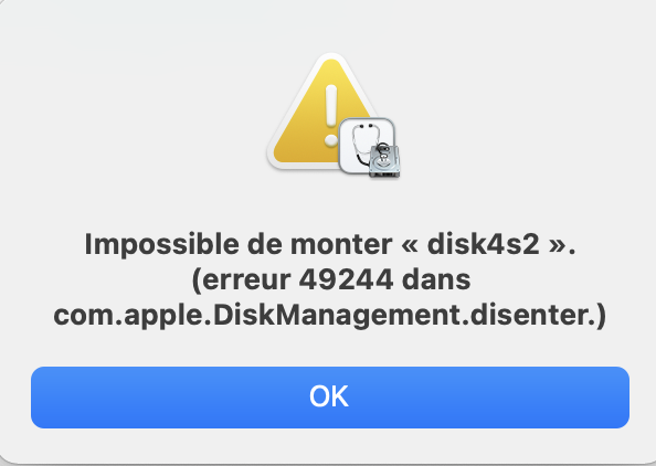 Lorsque j’ouvre utilitaire de disque je vois son nom « disk5s2 » non monté. Je vois volume physique externe USB.ExFAT capacité: 8,39 To disponible: Zéro ko. Si j’essaie de le monter il y a le message:  »impossible de monter « disk5s2 ». (erreur 49244 dans com.apple.DiskManagement.disenter.) ».