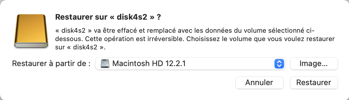 J'ai d'abord essayé prudemment de restaurer le disque en sélectionnant un de mes disques durs. Impossibilité de le faire apparemment pour incompatibilité des formats entre les deux partitions. J'ai recommencé en essayant de restaurer avec mon disque interne Macintosh HD sans plus de succès, toujours refus mais avec une formulation un peu différente mais sans doute aussi une incompatibilité de formats.