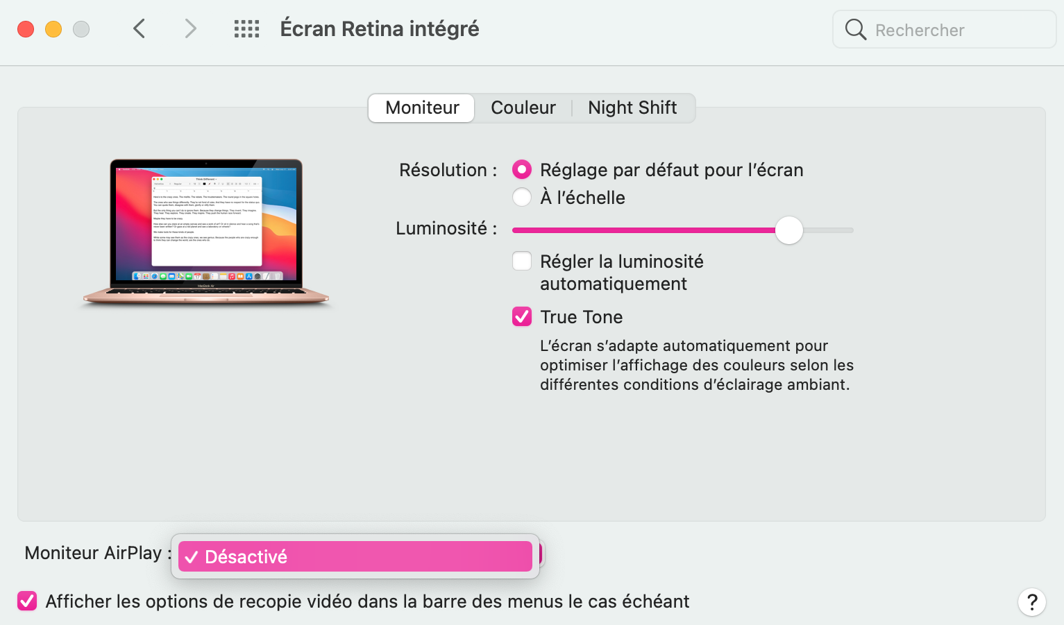 Bonjour, j'ai un MacBook Air 2020 qui est actuellement sur le macOs Big Sur car je n'ai pas encore installé le Monterey :) je voudrais partager d'écran de mon Mac avec mon iPad 8e génération, mais j'arrive pas à activer le moniteur Airplay sur mon ordi, l'option "Activer" n'est pas affiché pour que je puisse choisir (cf. photo ci-dessous).