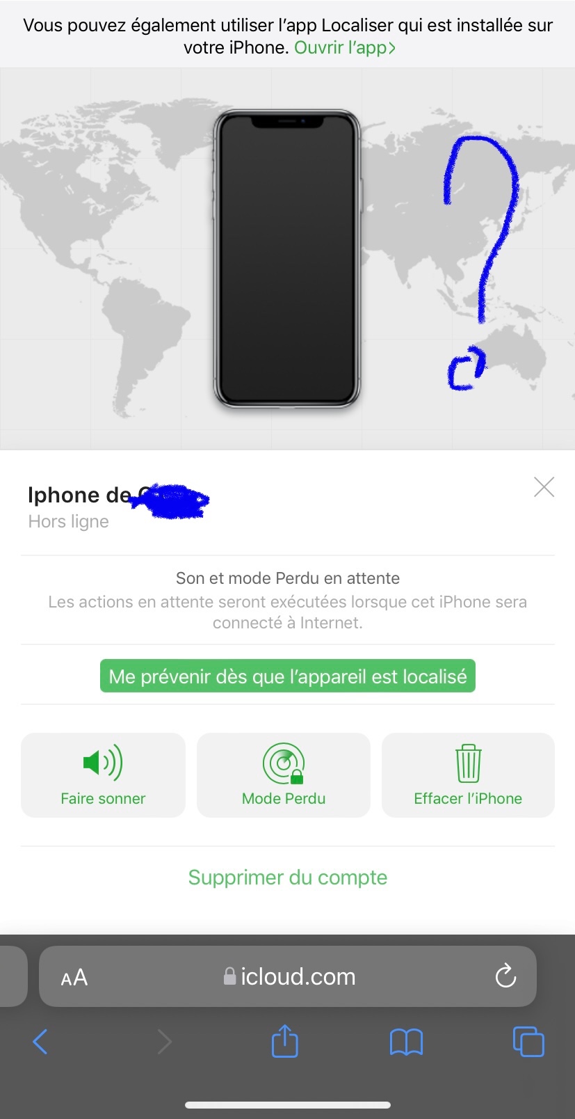 car si vous prenez le téléphone de quelqu’un d’autres pour utiliser l’application « localiser », cela vous dirige sur iCloud.com, du coup, vous ne pouvez toujours pas voir le téléphone éteint.