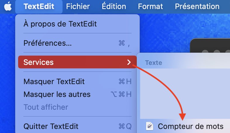 "Maintenant depuis TextEdit, tu sélectionnes le texte (command + A) et dans le menu déroulant tu choisis "Services".