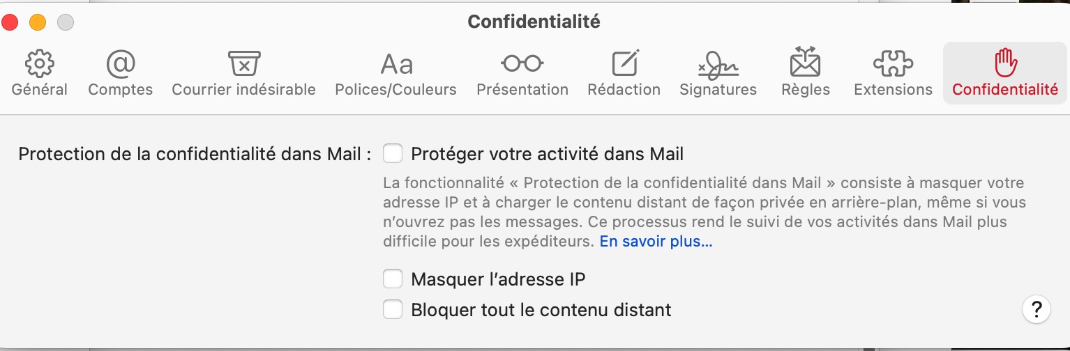Dans mail > Preferences > aller dans /confidentialité et décocher toutes les cases.