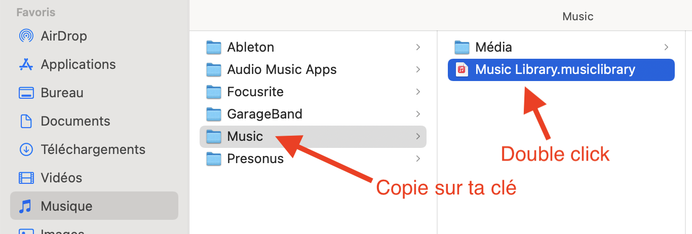 Copie le répertoire Music sur ta clé et double click sur le ficher "Music Library.musiclibrary" situé sur cette clé USB