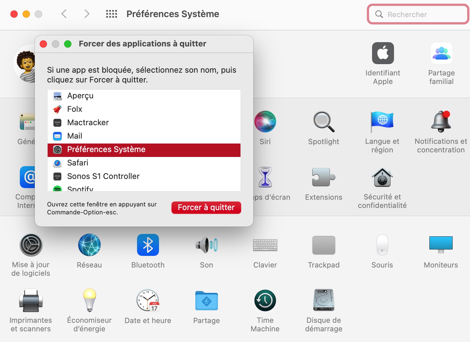 débloquer la fenêtre des préférences système, cliqueR sur "Pomme" puis sur "Forcer des applications à quitter".