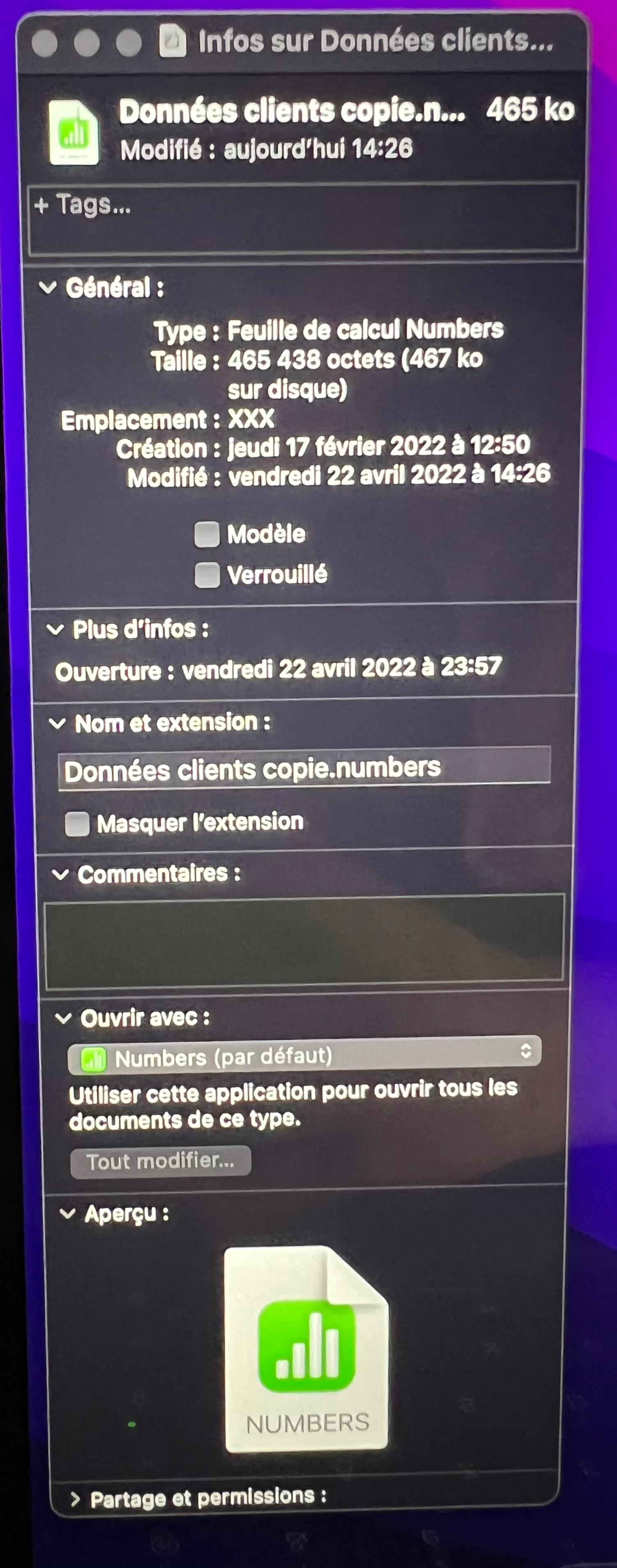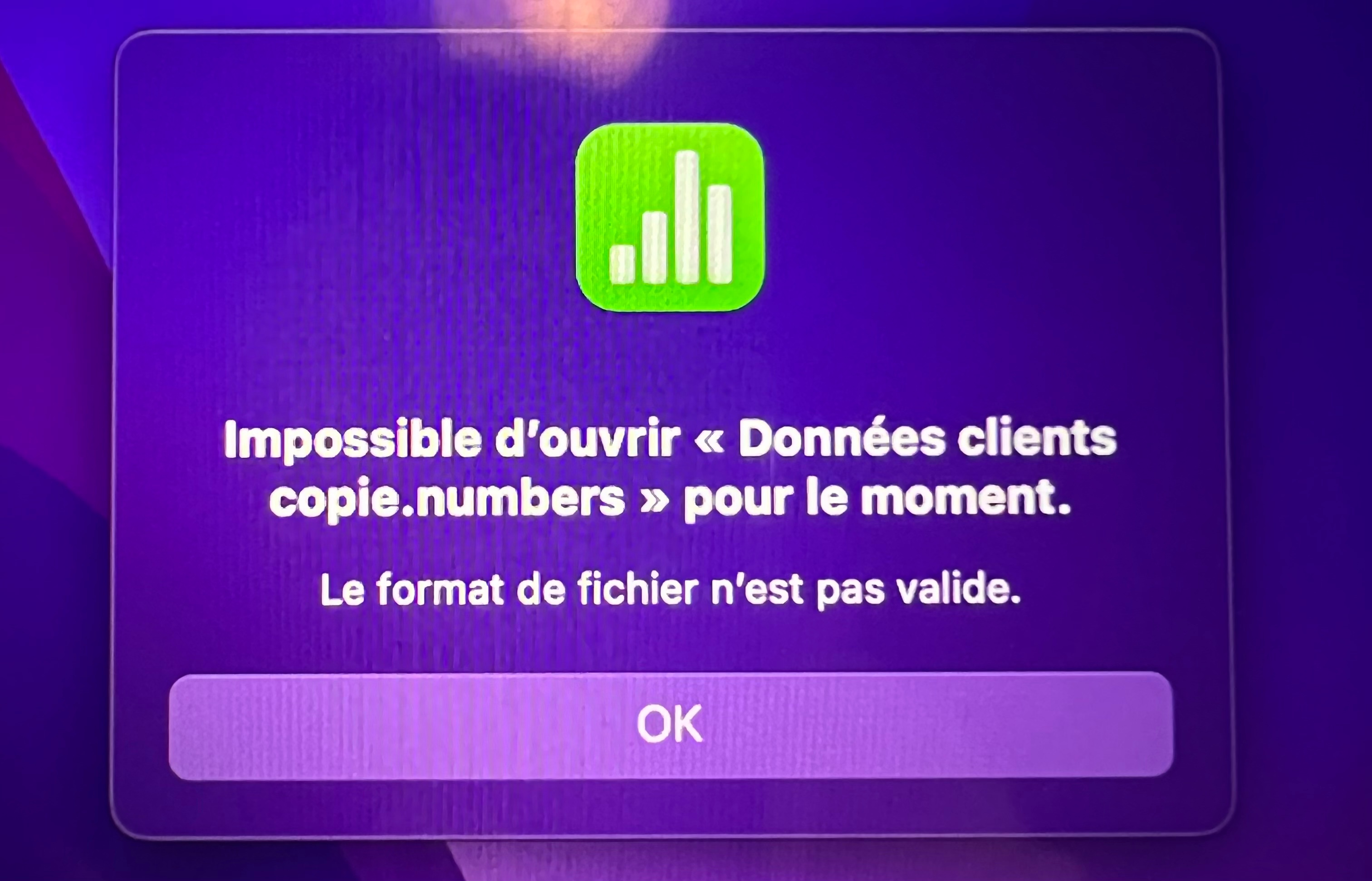 Bonjour, j’ai eu un gros soucis aujourd’hui sur un fichier numbers sur lequel je travaille depuis plusieurs mois. Encore aujourd’hui aux alentours de 14h je l’ai ouvert et modifié, puis je l’ai enregistré et fermé comme d’habitude. Ce soir j’essaye de l’ouvrir et c’est impossible. Lorsque je clique sur le fichier, le message suivant s’affiche « le format fichier n’est pas valide ». J’ai tout essayé. Je l’ai dupliqué, je l’ai copié sur mon bureau (il était jusqu’à présent stocké sur clé USB), j’ai essayé de me l’envoyer par mail, de l’envoyer sur un iphone, de l’ouvrir à partir des fichiers récents de Numbers, de supprimer l’application Numbers et de la réinstaller, de l’ouvrir à part d’un autre compte utilisateur. Absolument rien n’a fonctionné j’ai toujours ce même message. L’application Numbers est à jour, le logiciel du Mac est à jour, tous les autres documents présents sur la clé USB s’ouvrent sans problème et je peux toujours créer un nouveau fichier Numbers.