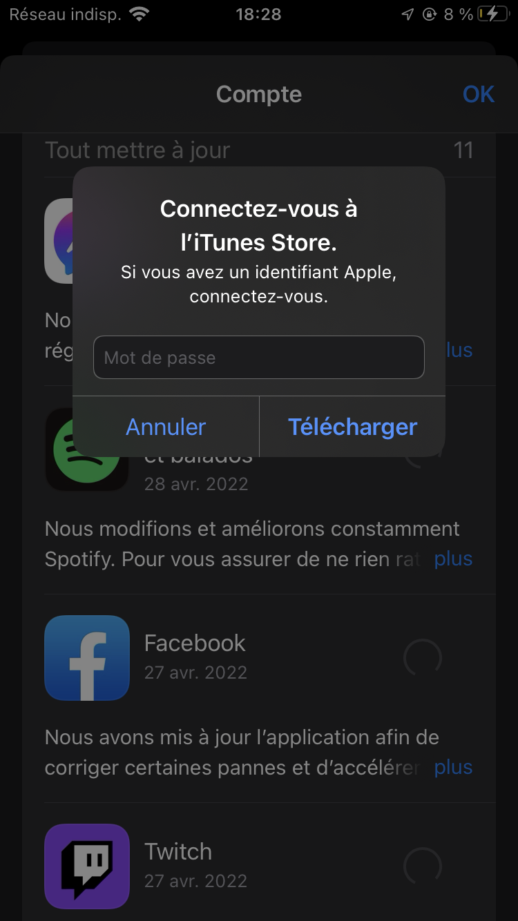 Donc je veux mettre a jour mes aplications, mais ca me dis qu’il faut que je me connecte a l’itune store pour ca. S’il vous plaît aider moi