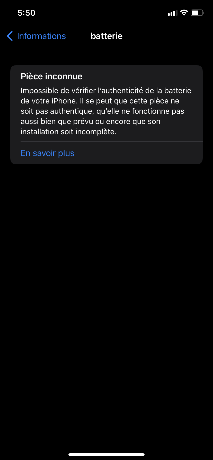 Si vous avez changé la batterie avec une pièce non-certifiée Apple, vous ne pourrez pas vous débarrasser de ce message. Si vous n’avez pas changé la batterie, ce message indique un problème matériel potentiel. Dans ce cas, faites vérifier votre iPhone dans un Apple Store ou un centre de service agréé Apple.