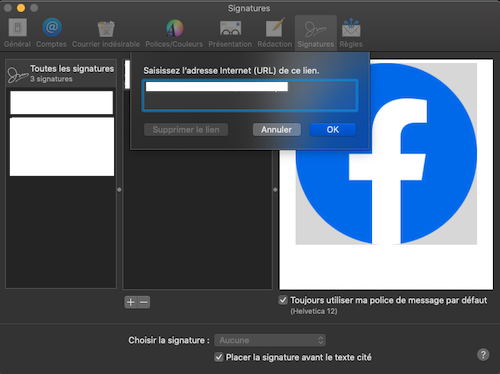 Je viens de lire le truc suggéré en mai 2020 par "The_knight" : "Sélectionne le et appuie ensuite sur les touches ⌘+K, tu devrais voir apparaître un espace pour ajouter l'URL." Source : Signature mail avec image et lien hypert… - Communauté Apple