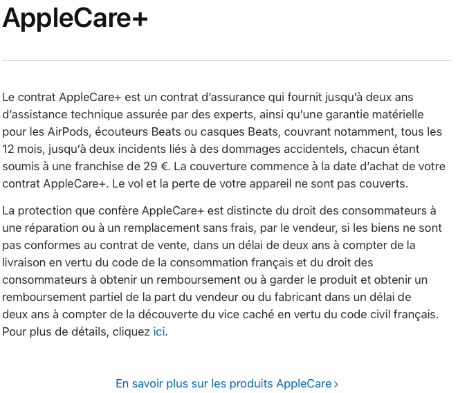 Du coup, si quelqu'un sait ce que couvre Apple Care pour des AirPods, ça m'intéresse.