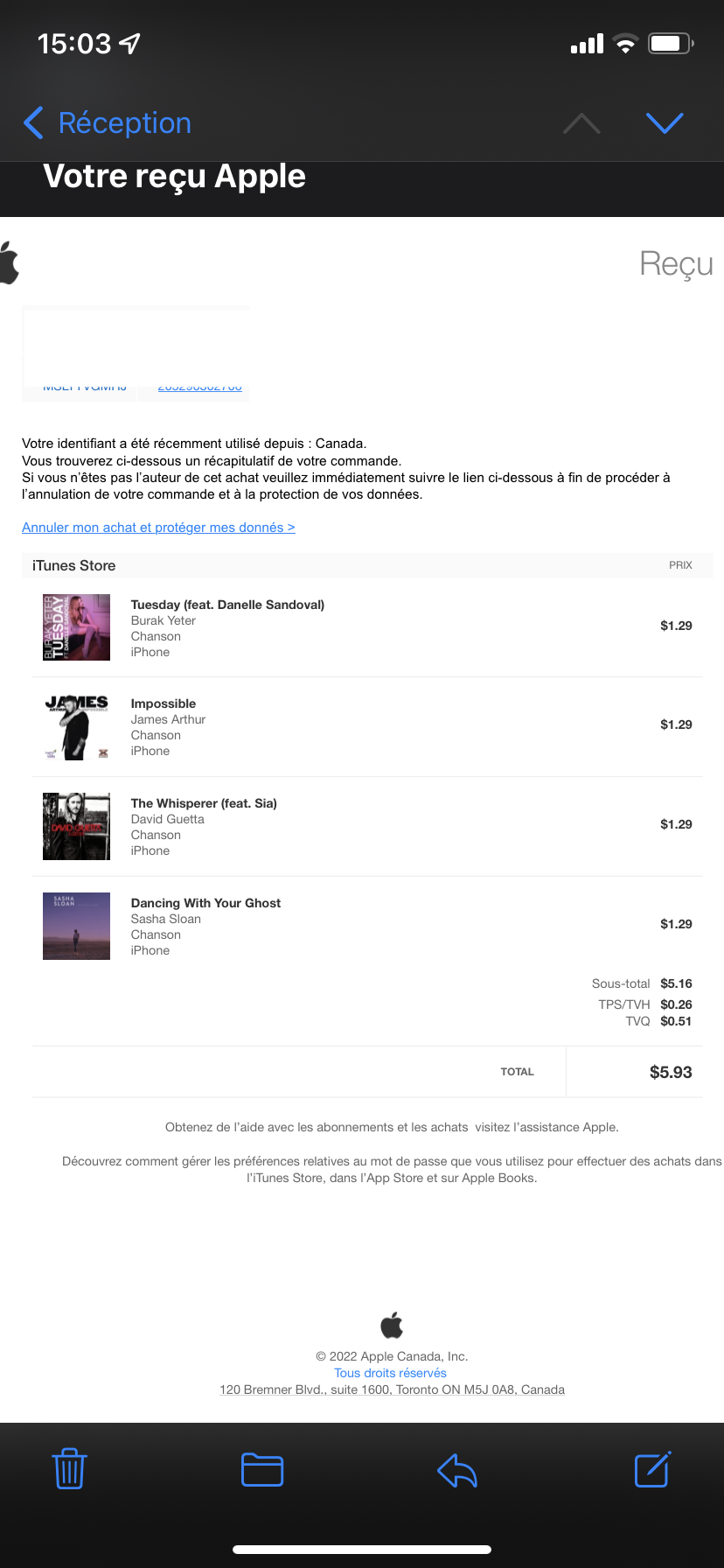 je suis actuellement en train de recevoir des factures iTunes store du canada alors que j’habite paris et que je n’ai absolument pas effectué ces commande. J’ai changer mes mots de passe et j’ai pu voir qu’un iphone était connecté à mon compte icloud j’ai supprimer l’appareil grave à icloud.com. Que puis-je faire de plus pour ne plus avoir de problème avec ce genre d’escros inconnu?