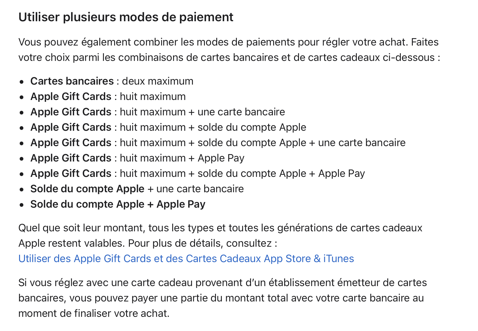 Sache que le système de carte-cadeau vient de changer (il y a encore quelques semaines les cartes permettant d'acheter des produits et celles pour la musique, les films... étaient différentes) il est possible qu'il y ait eut aussi du changement quant à leur utilisation.