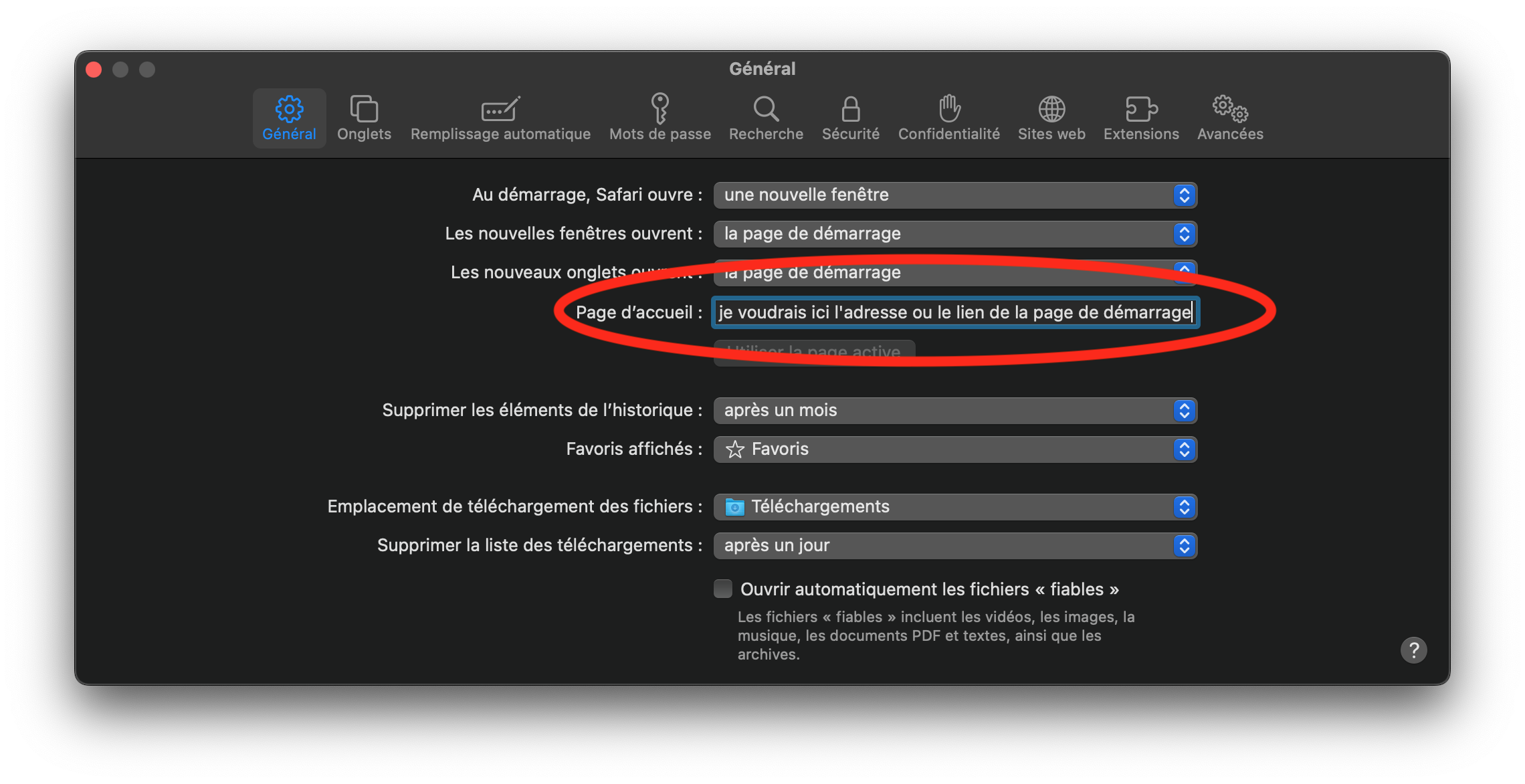Il n'y a pas d'adresse de la page de démarrage, c'est une indication sur le comportement que doit adopter Safari, ce n'est pas un contenu.