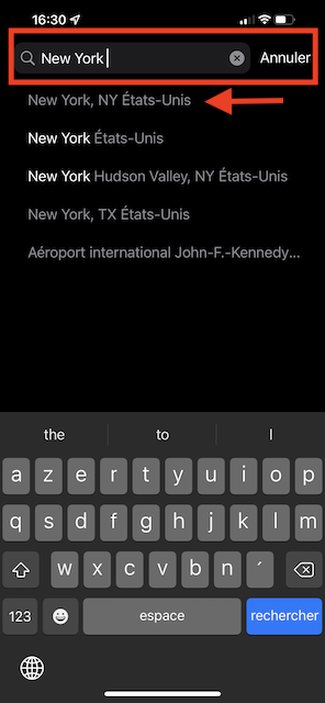 Etape 3 : Cherche la ville de ton choix dans la barre de recherche et clique sur le résultat correspondant.