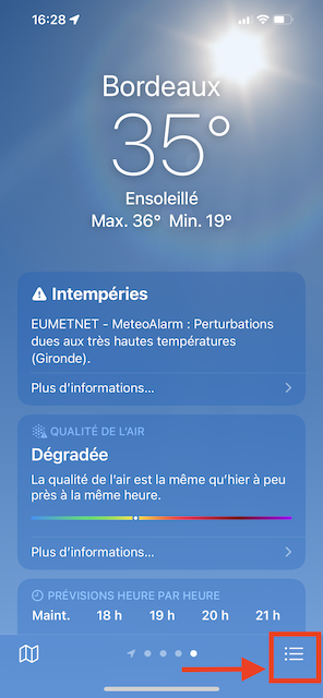 Étape 1 : Ouvre l'app Météo et clique sur le bouton en bas à droite de la fenêtre.
