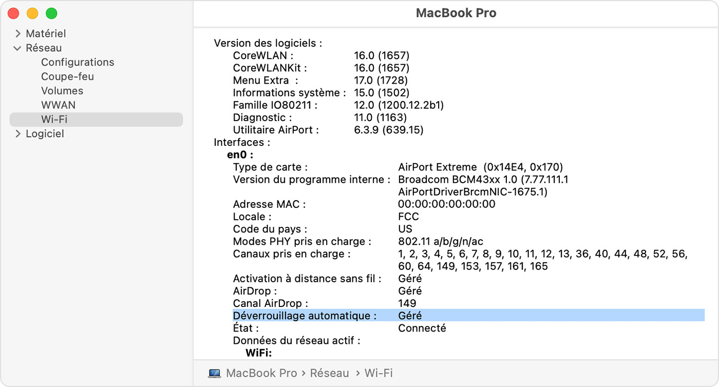 Afin de vérifier si votre Mac prend en charge le déverrouillage automatique, maintenez la touche Option enfoncée et choisissez le menu Pomme > Informations système. Sélectionnez Wi-Fi dans la barre latérale, puis recherchez « Déverrouillage automatique : Géré » sur la droite :
