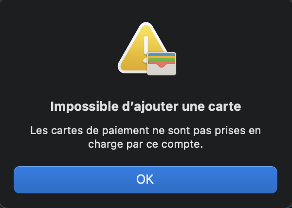 lorsque j'essaie d'ajouter une carte de paiement à cartes, le message suivant apparait: "impossible d'ajouter une carte de paiement car votre compte ne prend pas en charge les cartes de paiement"(voir jointe