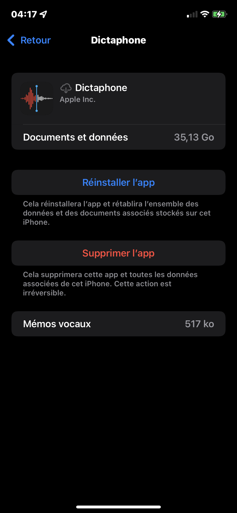 J'ai 35, 13 Go contenu dans l'appli dictaphone qui sature mon stockage alors que je n'ai que 4,5 Mo de contenu audio rééls sur cette appli!