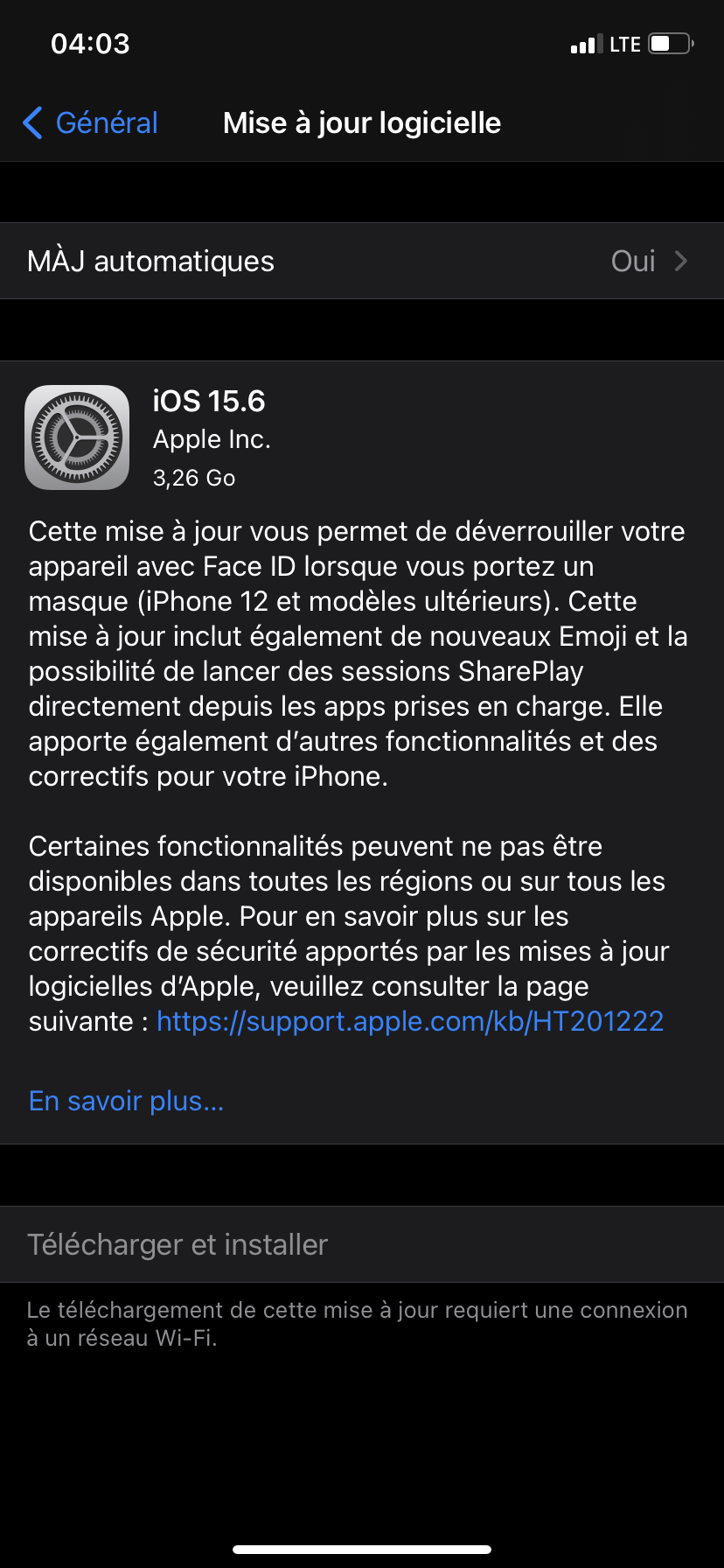 Si vous voyez le bouton "Télécharger et installer" de la mise à jour en gris, c'est parce qu'il faut que votre iPhone soit connecté à un réseau Wi-Fi pour pouvoir effectuer la mise-à-jour, et il faut idéalement qu'il soit en charge aussi car vous n'êtes pas à 100% de batterie.