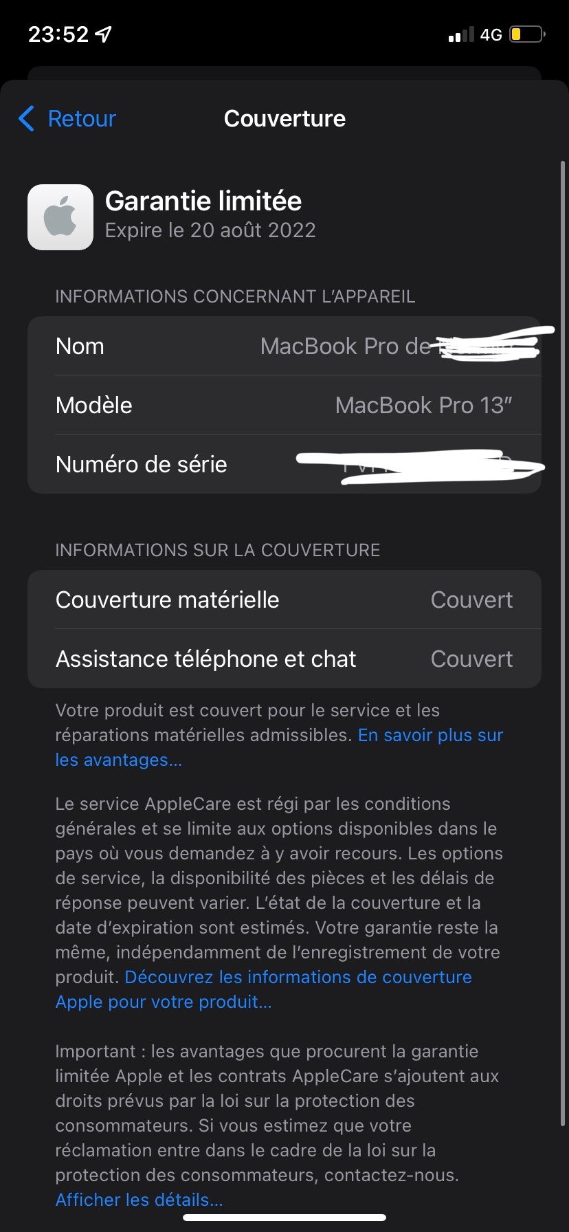 Je voudrais savoir si j’ai applecare + mais je ne comprends si je l’ai ou pas… J’ai cassé mon écran (MacBook pro 13" 2020) et j’aimerai le réparer au plus vite sachant que j’ai une garanti limité jusqu’au 20 août 2022 et je ne sais pas si c’est AppleCare + ou autre chose..
