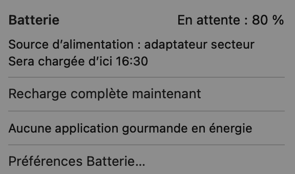 Plus sérieusement, le Mac, pour préserver votre batterie, apprend vos habitude de charges et l'adapté en conséquence. Vous pouvez celle-ci en appuyant sur "Recharge complète maintenant".