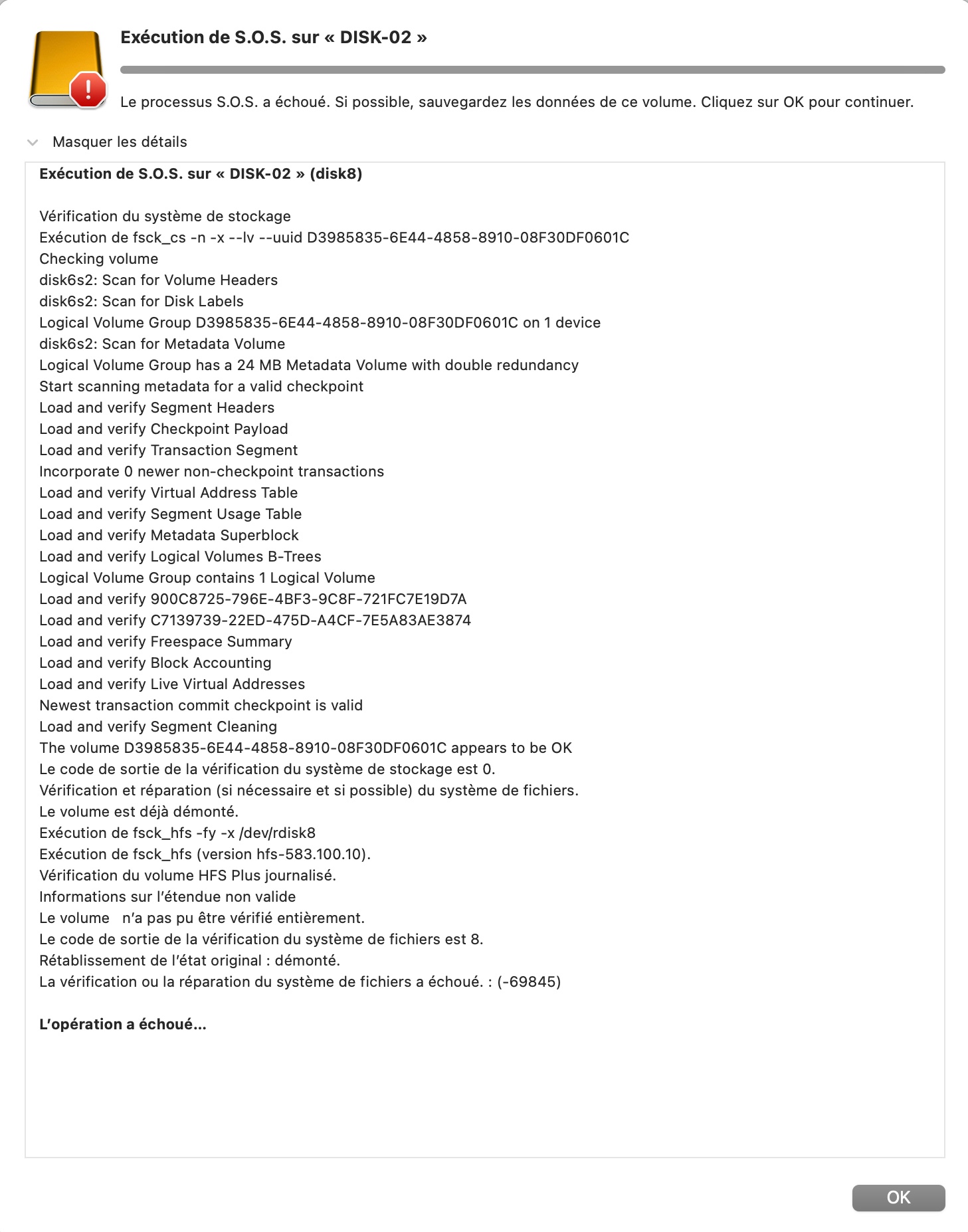 La vérification ou la réparation du système de fichiers a échoué. : (-69845)