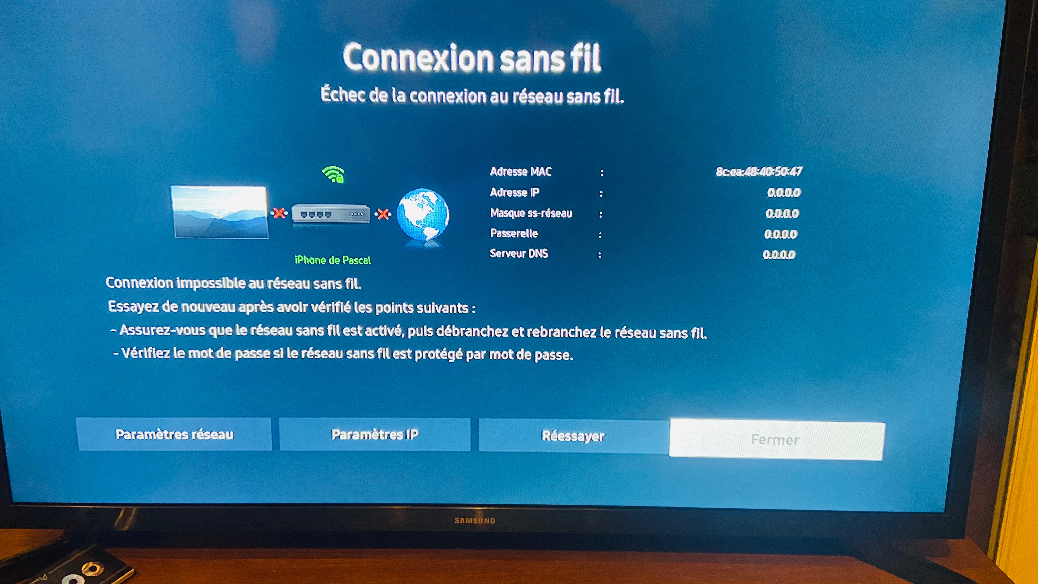 Echec de la connexion au réseau sans fil.