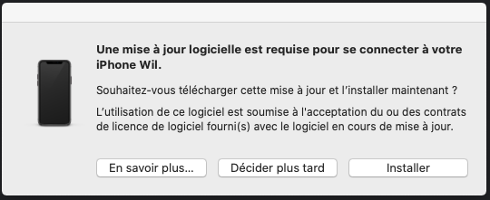 Une dernière chose à essayer : lorsque vous branchez votre iPhone à votre Mac, attendez d'avoir ce message de mise à jour logicielle, débranchez votre iPhone, attendez quelques instants et faites la mise à jour.