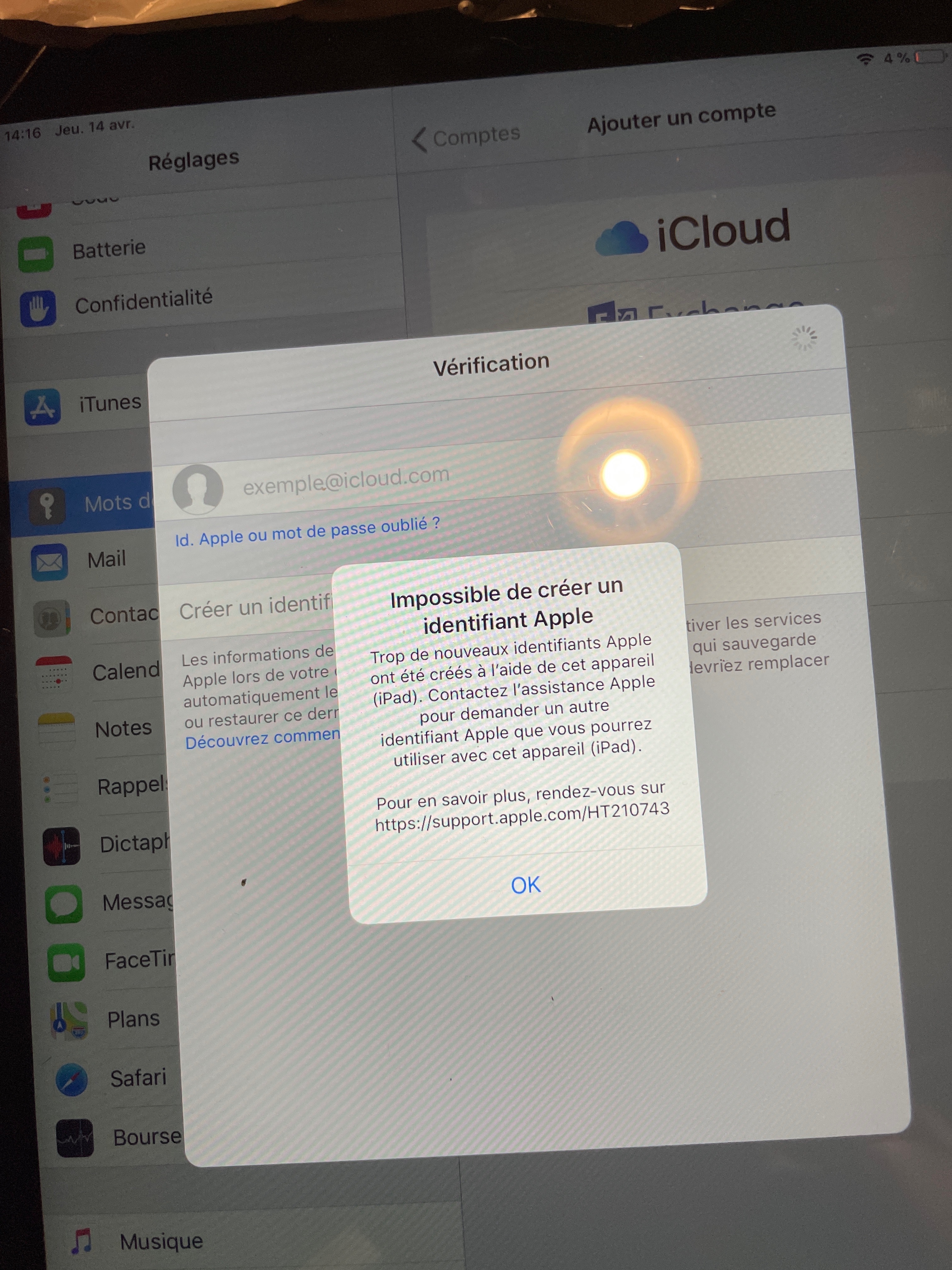 Bonjour, je vient d’acheter un ipad d’occasion et impossible de crée un compte iCloud