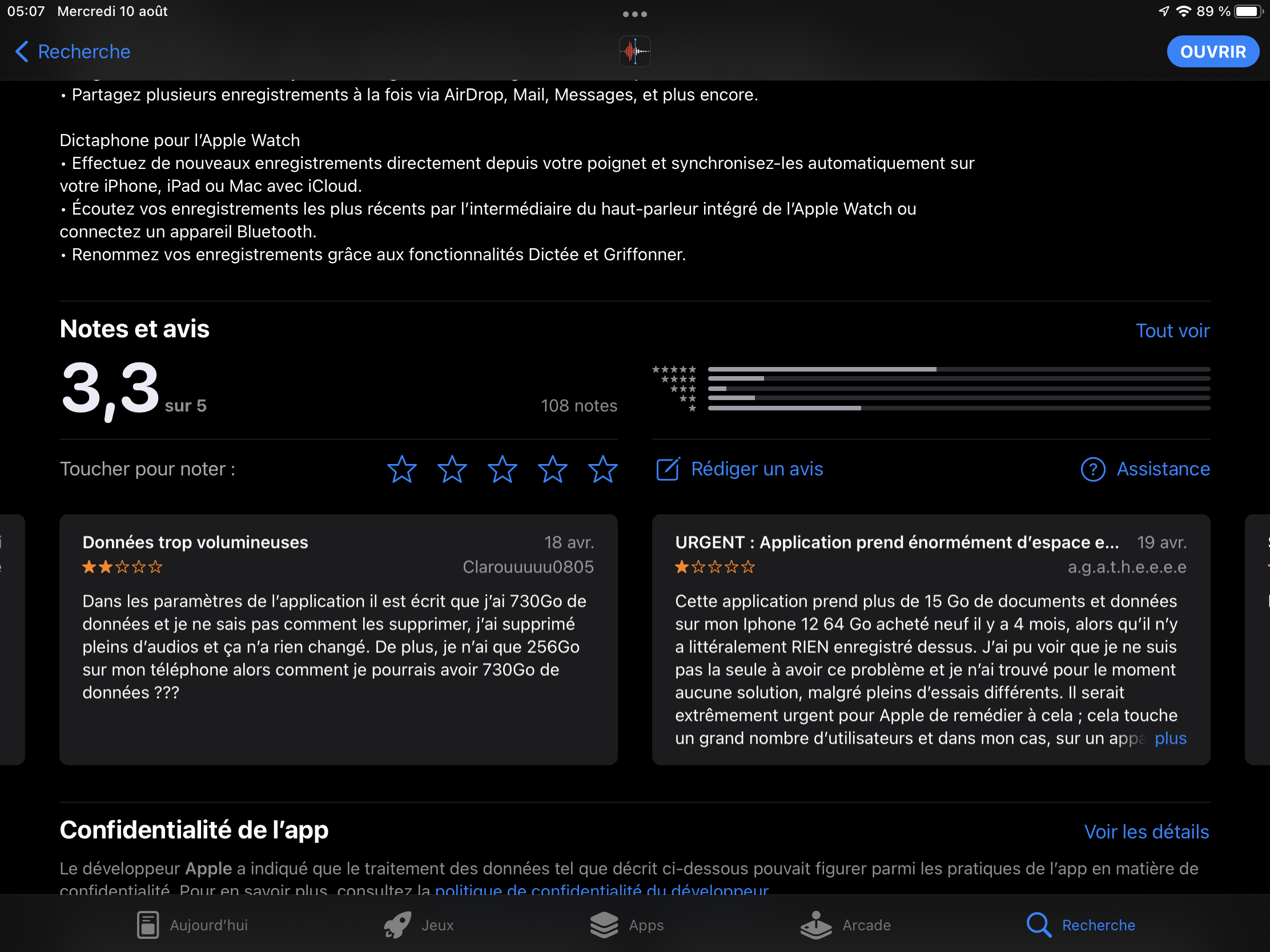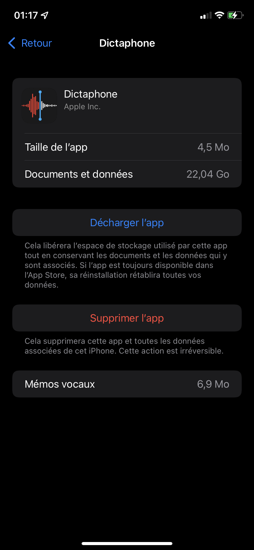 Je poste ce nouveau sujet en quête d’une solution car un autre poste présentait le même problème que moi mais la solution qui était proposée n’a pas fonctionné dans mon cas: j’ai enregistré mes mémos que je voulais conserver dans fichiers et désinstallé l’application dictaphone mais cette dernière n’a jamais vraiment disparue de mon stockage. Je garde toujours 22 giga de stockage alors que j’ai seulement quelques mo de fichiers…