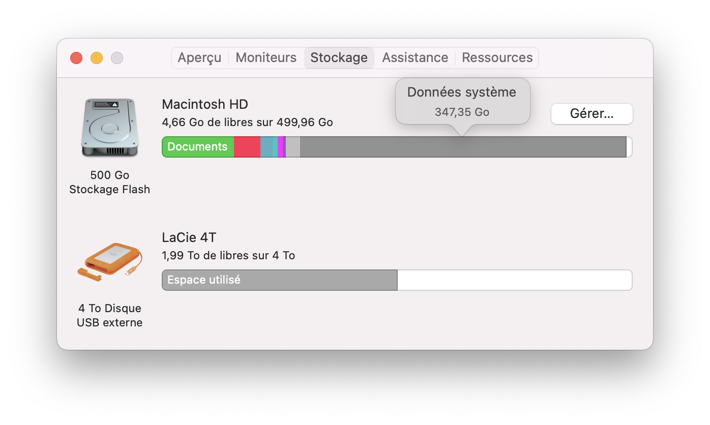 Ah, petite réflection en cours de rédaction de ce message ... : J'avais installé mon MacBook en dual boot car j'avais encore des programmes très important pour moi qui ne fonctionnaient plus avec un macOS postérieur à Sierra. Donc, j'avais une partition en macOS Sierra et une autre qui était sous les différentes versions qui ont suivi (Monterrey à l'heure actuelle). Comme ça fait des jours que je me bats avec mon manque de place, j'ai supprimé la partition macOS Sierra (peut-être comme un idiot) mais ça n'a rien résolu. C'était peut être pas un excellente idée ...