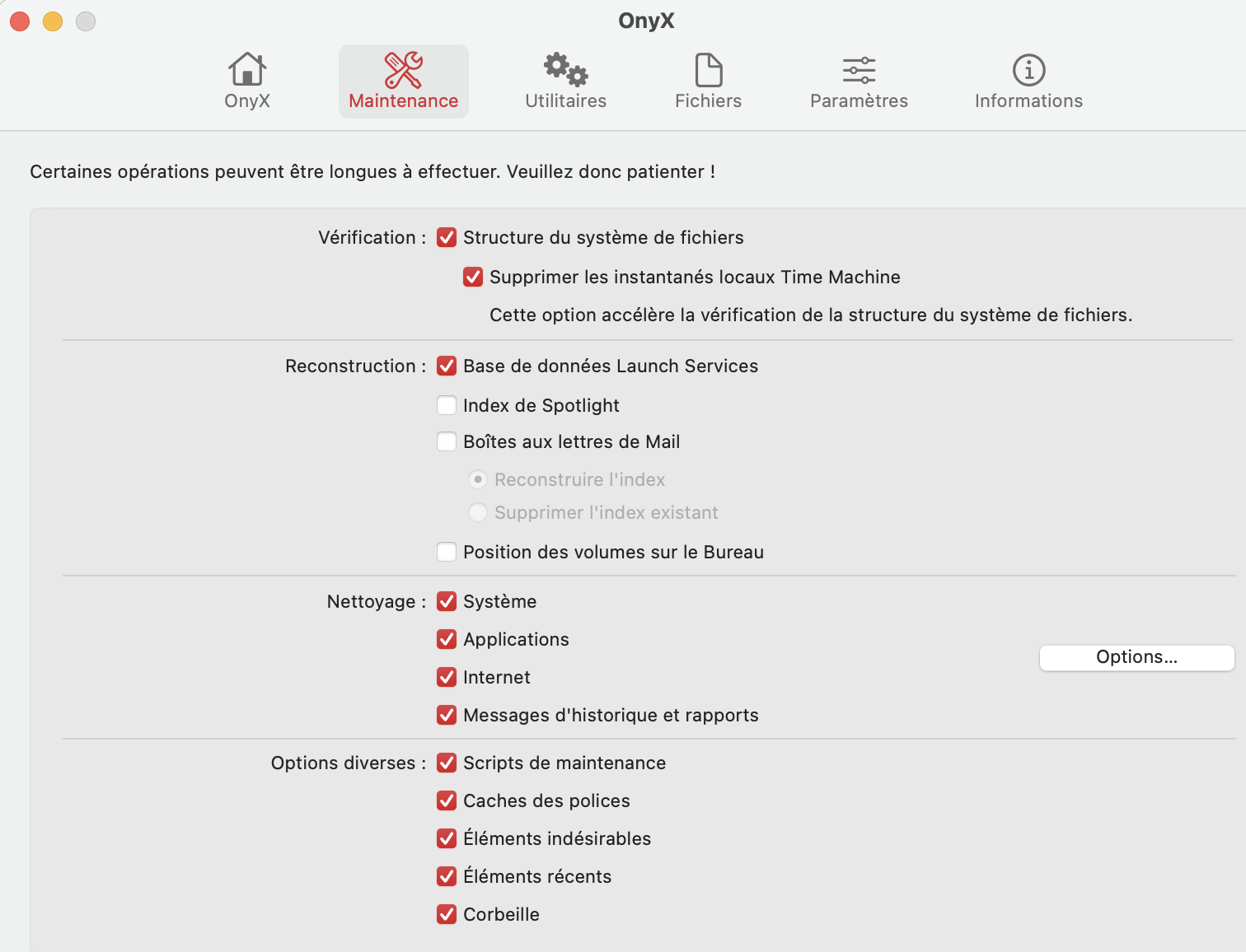 Pense à cocher la case des instantanés locaux sur OnyX (si bien sûr tu utilise Time Machine)