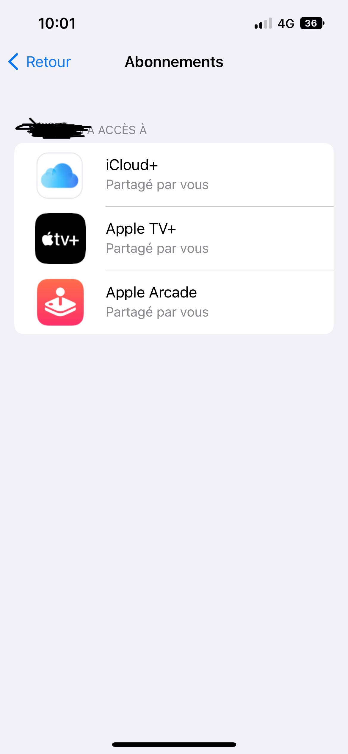 Dans les réglages « gérer les abonnements » l’option « partager avec la famille » est active.