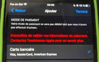 quand j'ai fait l'ajoutement de la carte bancaire la carte n'est pas ajouter il ma envoyer un message de contacter l'assistance apple pour en savoir plus
