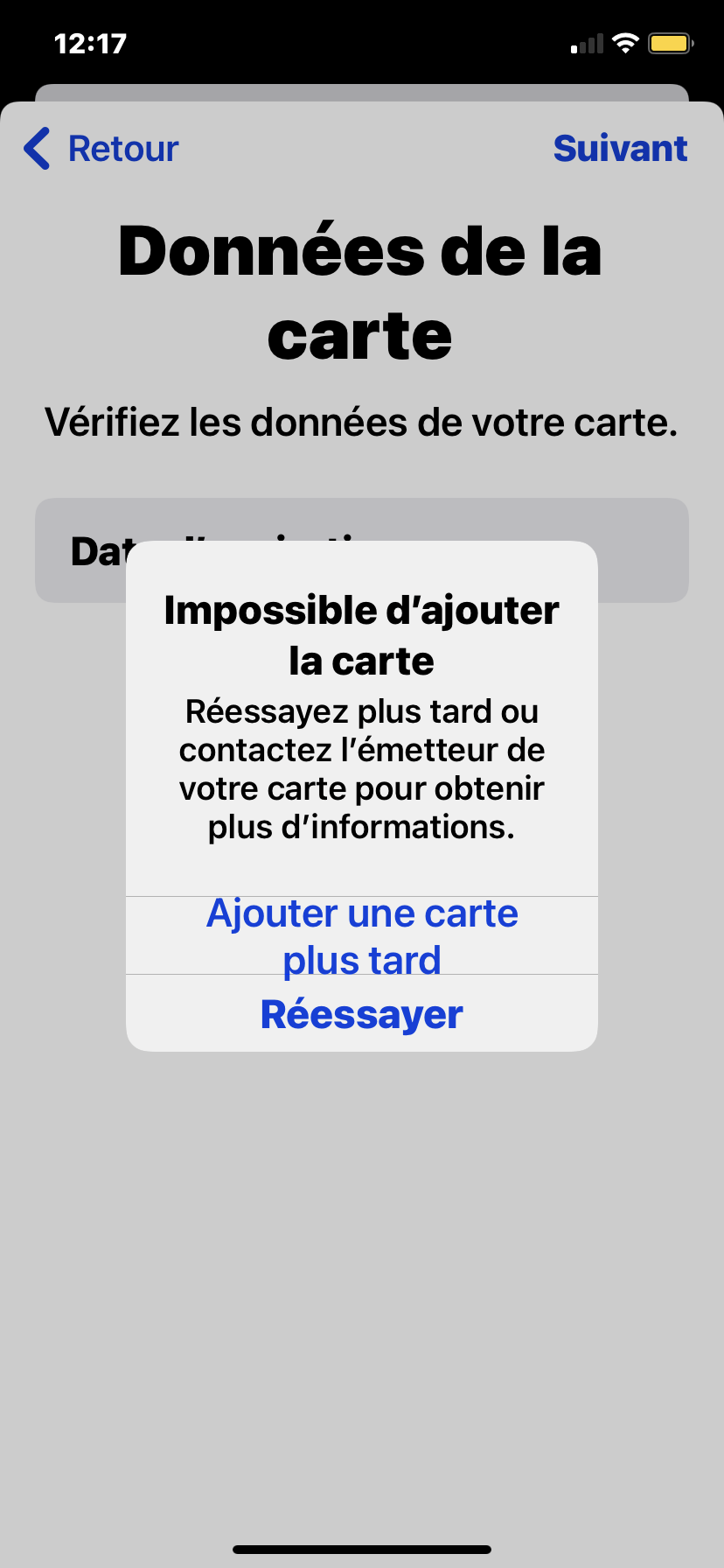 Impossible de rentrer mes cartes guichets Desjardins :impossible pour le moment ,veuillez recommencer et ça ne change pas depuis 5 jours À qui la faute ? Apple , Desjardins dit que mes cartes sont Ok