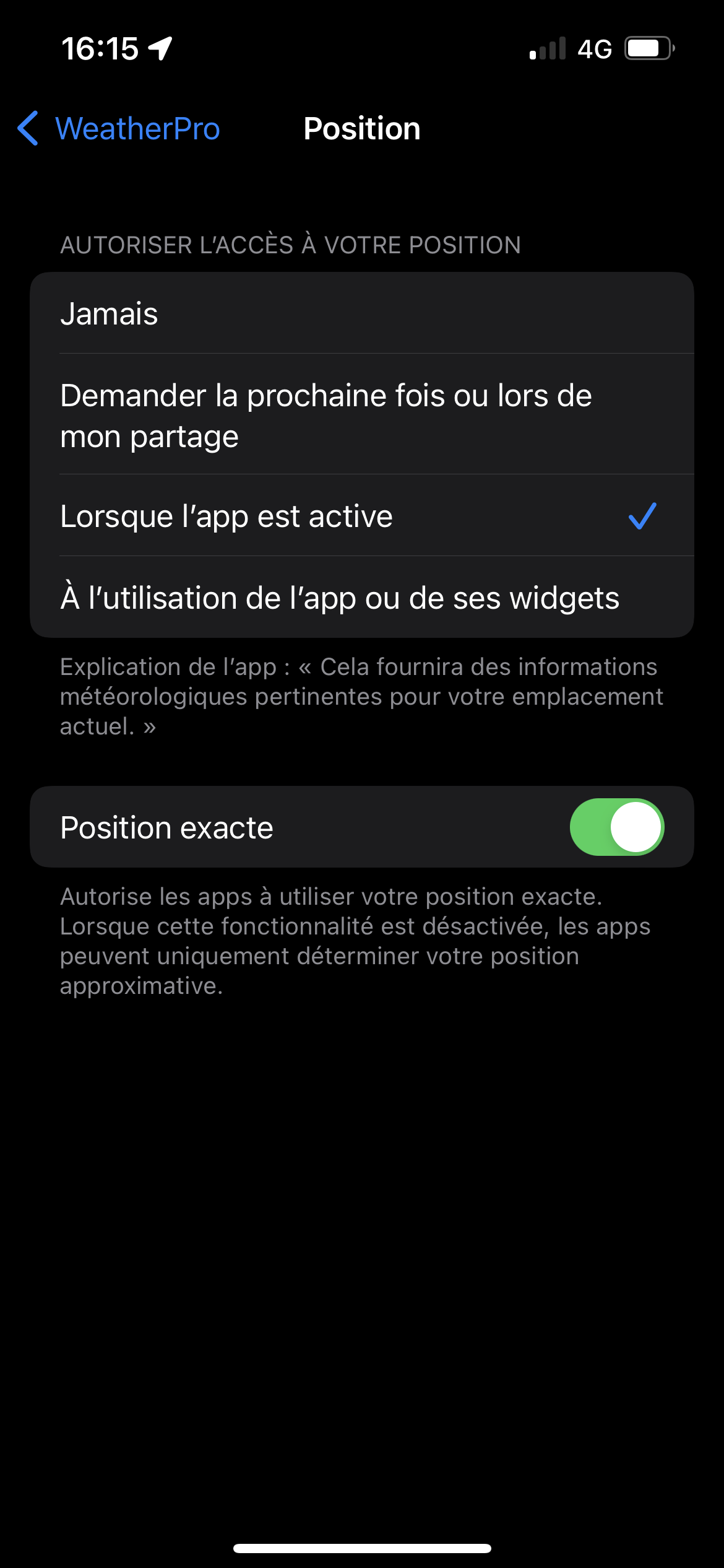 Pourtant cela fonctionne bien avec l’application météo d’Apple et j’ai bien validé la géolocalisation lorsque l’application est active et je n’ai pas de VPN