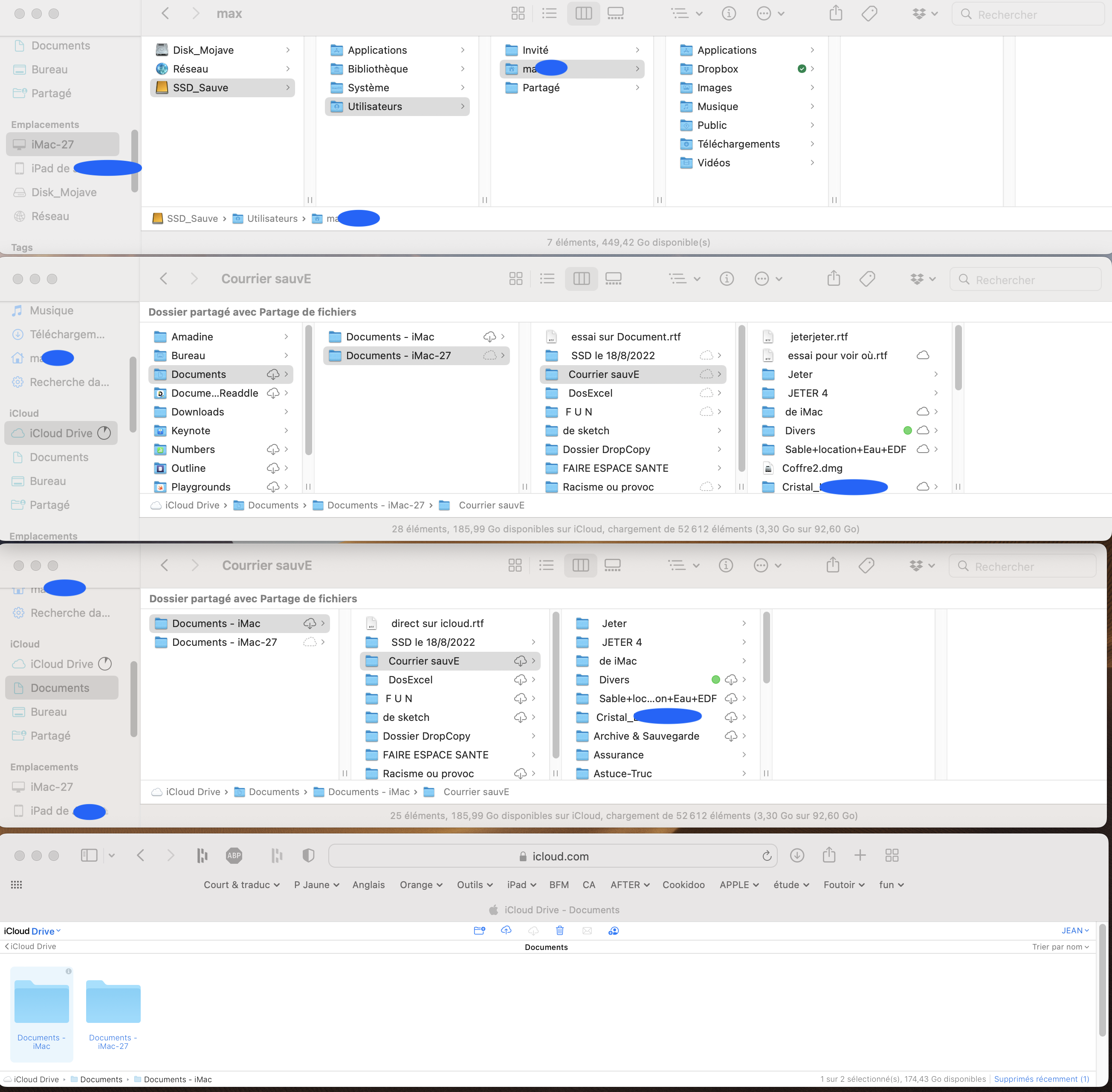 Sans plus de résultat : tous mes documents depuis le mois de juin sont toujours disparus, MÊME 3 DOCUMENTS EXCEL QUE J'AVAIS DRAGUÉ DIRECTEMENT DANS ICLOUD et je dois à nouveau jongler avec "iCloud drive (archive)" pour remettre tout à sa place.
