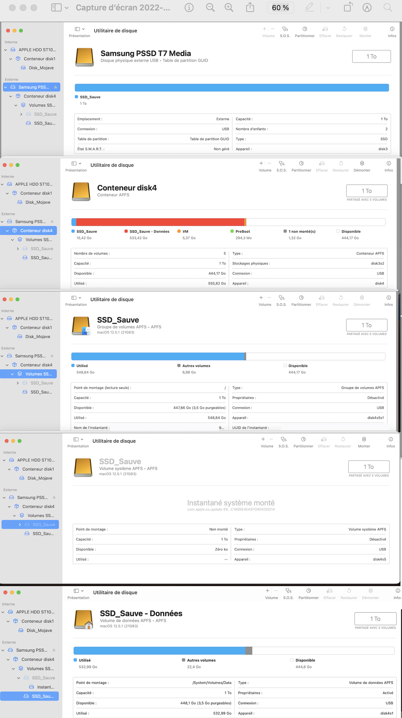 Je viens d'étudier un peu plus en détail vos captures d'écran. Si je ne me trompe pas, votre Mac est équipé d'un HDD (disque dur) et vous utilisez un SSD externe pour faire tourner l'OS ? Ou bien votre OS est-il présent sur le HDD ?