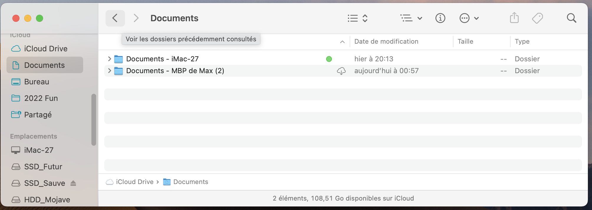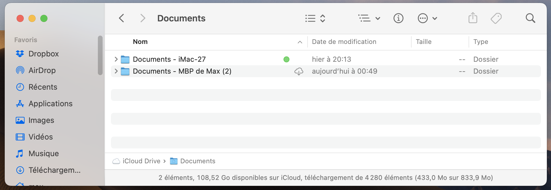 Quand je sélectionne Documents dans la barre latérale j'y vois les 2 éléments correspondants aux 2 Macs, mais rien pour les réunir en une seule chose sur iCloud