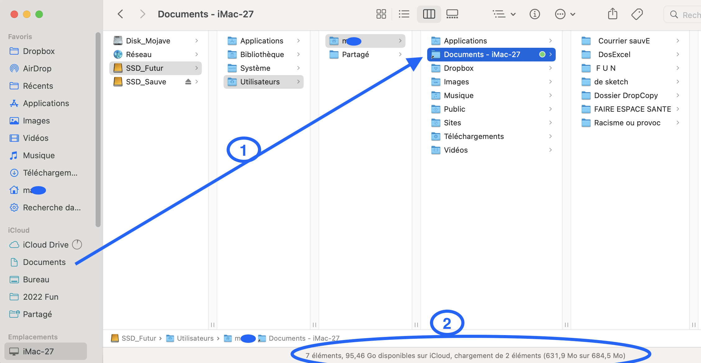 La photo qui suit montre les 2 espaces iCloud correspondants aux 2 disques SSD, je vais aller supprimer le "iCloud" de l'autre pour économiser de l'espace dans le nuage, et simplifier les sauvegardes futures de fichiers (maintenant, "Documents" n'est plus naturellement dans "l'utilisateur / ma... " )